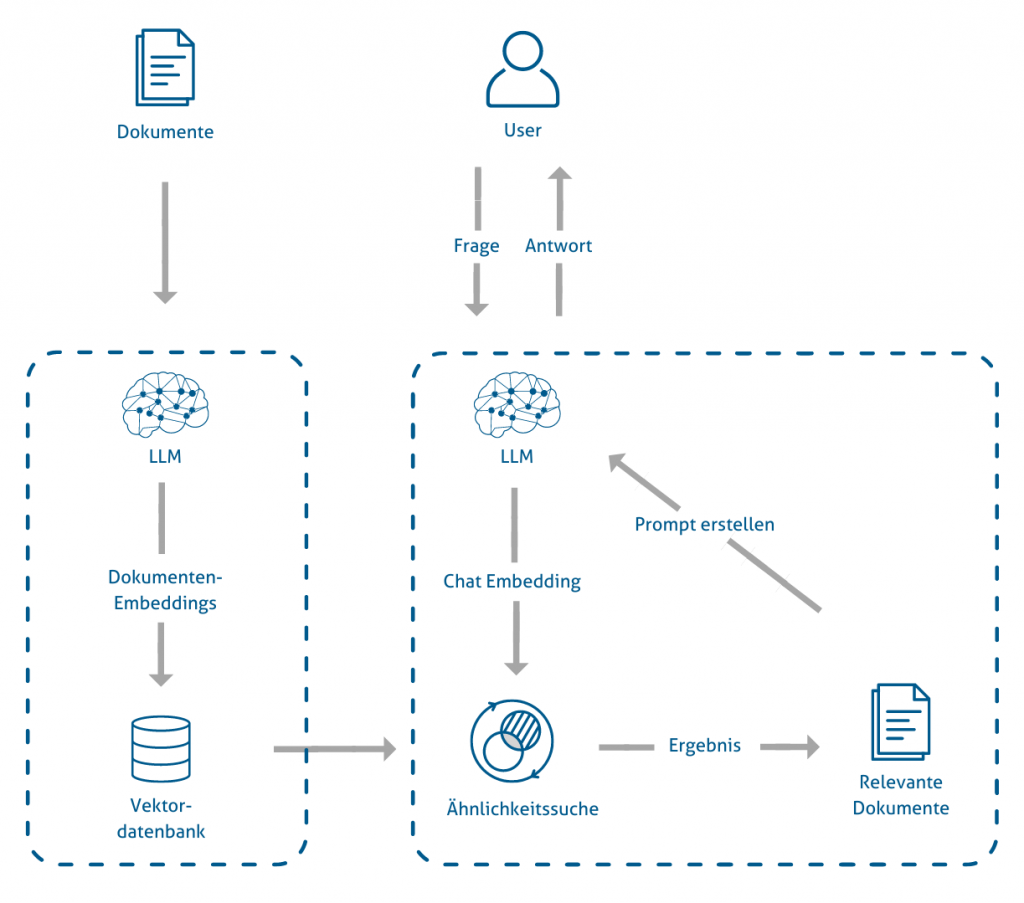 Wenn der User nun eine Suchanfrage stellt, wird diese ebenfalls mit dem gleichen Embedding transformiert und mit den Dokumentenvektoren aus der Vektordatenbank verglichen. Zur Bestimmung der Ähnlichkeit zwischen zwei Vektoren wird die Kosinus-Ähnlichkeit verwendet. Das ist der Kosinus des Winkels zwischen den beiden Vektoren. Bei normierten Vektoren kann äquivalent die euklidische Distanz verwendet werden. Unter Berücksichtigung der Kosinus-Ähnlichkeit werden die k nächsten Dokumente zurückgegeben. Dabei ist k die Anzahl der zu berücksichtigen Dokumente und wird je nach Use Case und Länge der Dokumente gewählt, da wir die begrenzte Kontextgröße der LLMs berücksichtigen müssen.